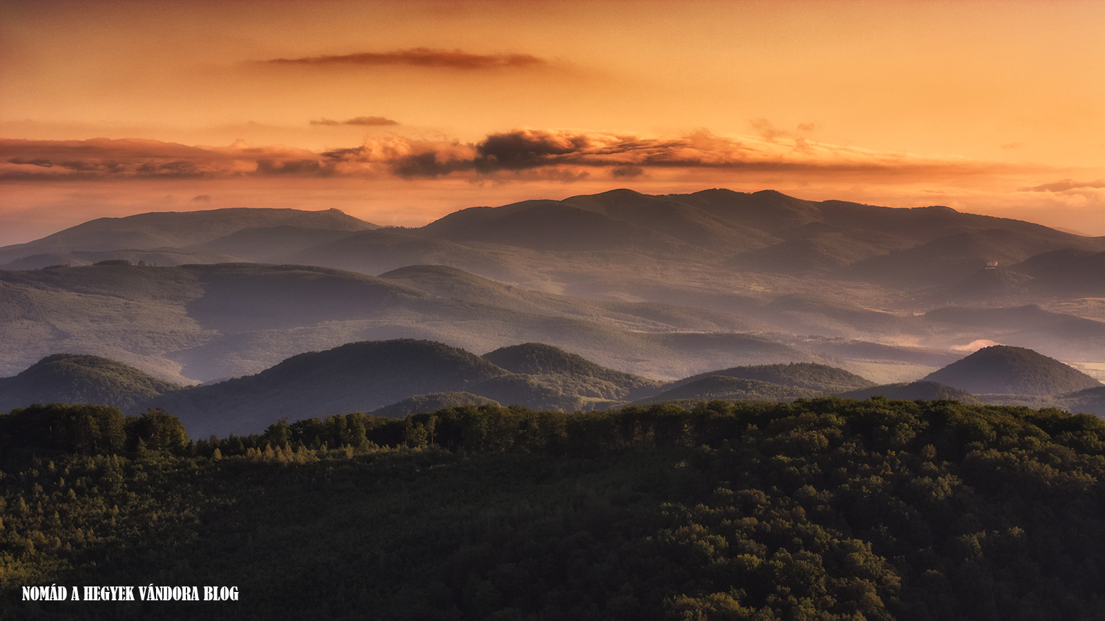 Hajnali panoráma a Nagy-Péter-mennykő csúcsáról. A távolban jobbra a Nagy-Milic hegycsoport s a Hegyköz lankái |