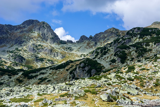 | Szemben a Bukura-katlan északi részének vad sziklás terepe és balról a Bukura-csúcs |